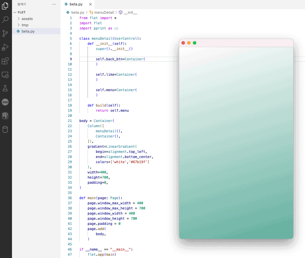 파이썬 Flet 에 대하여, pip install flet 2026년 02월 21일2023년 11월 05일 작성자: KDM AI, 인공지능, 여튼 요즘 나오는 대부분의 신기술은 파이썬만큼 잘 서포트해주는 언어가 없지 않나하다. 웹,데스크탑, 모바일 모두를 아우를수 있는 괜찮은 파이썬패키지이다. pip install flet 모바일 안드로이드, 애플 모바일앱, 웹, 데스크탑 어플리케이션 모두 가능하다. 웹으로 개발한 내용 그대로 데스크탑 스탠드얼론으로 곧바로 구동할 수 있다. 무엇보다도, 파이썬 언어기반이라서 좋다. 생산성 하나는 파이썬이 최고다. http//flet.dev 샘플코드를 만들어본다